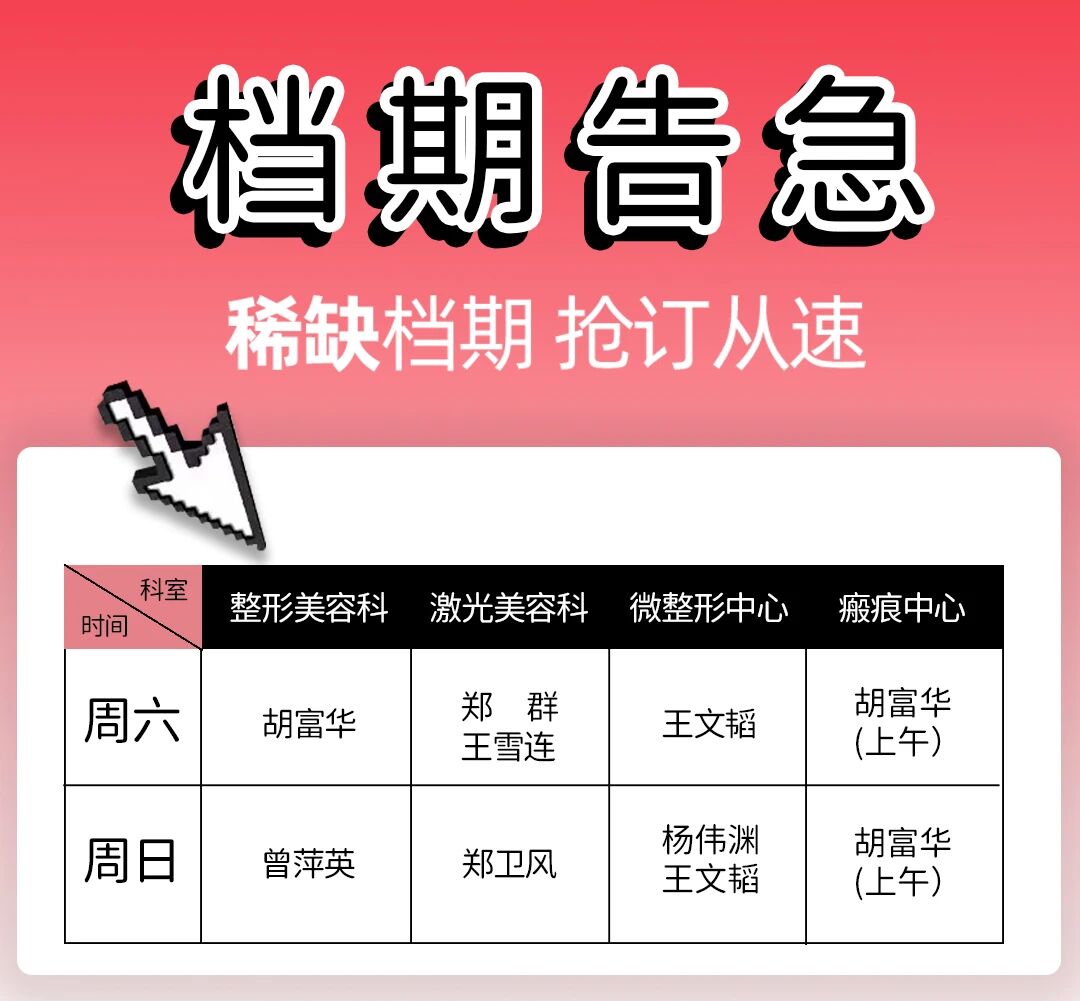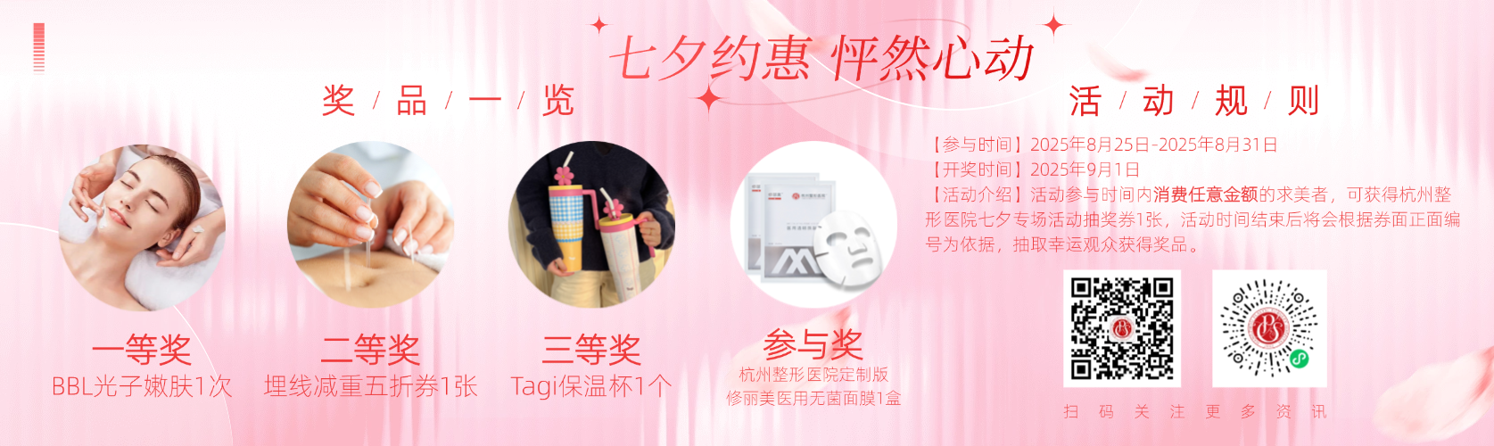 為 / 愛 / 放 / 價 當星河傾瀉愛意,當時光遇見年輕 真正的浪漫,是勇敢去愛,也是坦然被愛 這個七夕,讓美麗與愛意共同綻放 以最自信的姿態(tài),迎接屬于您的怦然心動 活動時間: 活動期間,所有到院顧客只需在精心布置的七夕主題打卡區(qū)拍照留念,并將照片分享至社交平臺,即可獲得一份精心準備的七夕限定禮品(限量100份)。 讓每一次分享都成為美麗的見證。 活動期間消費顧客不論金額大小,均可得抽獎券一張,每張抽獎券都有特定編號,活動結束后(9月1日)開獎,隨機抽取一二三等獎、參與獎,獎品分別為: 一等獎:BBL光子嫩膚 二等獎:埋線減重五折券 三等獎:tagi水杯 參與獎:杭州整形醫(yī)院定制版修麗美無菌醫(yī)用面膜 【七夕特惠】 美麗投資超值套餐 胡富華 副主任醫(yī)師 擅長項目:疤痕修復整形、脂肪塑形、饅化臉修復、腹壁成形、口唇整形、眼鼻整形、除腋臭,富貴包等。 中國整形美容協(xié)會瘢痕醫(yī)學分會委員 中國整形美容協(xié)會腫瘤修復分會委員 中華醫(yī)學會整形外科學分會瘢痕學組委員 中華醫(yī)學會整形外科學分會創(chuàng)面修復學組委員 中國醫(yī)師協(xié)會顯微外科醫(yī)師分會網(wǎng)絡培訓專委會委 中國康復醫(yī)學會修復重建外科委員會繼教委員會委員 中國老年保健協(xié)會基層皮膚病與醫(yī)學美容醫(yī)聯(lián)體分會 基層常務委員 浙江省醫(yī)學會整形外科學分會委員 浙江省整形美容行業(yè)協(xié)會醫(yī)學美容微創(chuàng)分會副會長 浙江省整形美容行業(yè)協(xié)會美容外科分會常務理事 浙江省整形美容協(xié)會疤痕整形分會理事 浙江省針灸學會醫(yī)學美容專業(yè)委員會委員 杭州市醫(yī)學會小兒外科分會委員 杭州市醫(yī)學會腫瘤學分會委員 專家簡介 鄭群 副主任醫(yī)師 擅長項目:各種面部除皺嫩膚、緊致提升,面部皮膚年輕化,皮膚色素斑如太田痣、咖啡斑、先天性雀斑、皮膚老化斑、色素痣,冷凍減脂,私密整形的激光治療等。 中國整形協(xié)會微創(chuàng)與皮膚整形美容分會常務委員 杭州市整形美容行業(yè)協(xié)會(美容皮膚專業(yè))專家委員 浙江省整形美容行業(yè)協(xié)會激光美容分會委員 浙江省整形美容行業(yè)協(xié)會醫(yī)學美容外科分會委員 浙江省康復醫(yī)學會修復重建委員會委員 專家簡介 楊偉淵 副主任醫(yī)師 擅長項目:微創(chuàng)注射美容(輪廓固定/面部下垂組織復位/動靜皺紋干預治療/玻尿酸、膠原蛋白注射)、綜合美學設計(結合情緒美學+光影折疊美學+“TOo”美學)、眼周/口周/頸部年輕化。 中國整形美容協(xié)會微創(chuàng)與皮膚美容整形分會常務委員 中國整形美容協(xié)會醫(yī)美與藝術分會線雕美容藝術專業(yè)委員 中國非公立醫(yī)療機構協(xié)會整形與美容專業(yè)委員會青年委員會委員 浙江省整形美容行業(yè)協(xié)會美容外科分會委員 浙江省整形美容行業(yè)協(xié)會抗衰老分會委員 浙江省整形美容行業(yè)協(xié)會面部年輕化與形體管理分會委員 浙江省整形美容行業(yè)協(xié)會疤痕分會委員 浙江省醫(yī)學會醫(yī)學美學與美容學分會青年委員 喬雅登+保妥適指定注射醫(yī)師 高德美(瑞藍+吉適)培訓講師 艾維嵐童顏認證醫(yī)師 雙美、弗縵膠原蛋白指定注射醫(yī)師 嗨體指定注射醫(yī)師 伊婉指定注射醫(yī)師 第八屆西湖·論劍學術大會微整注射“最佳效果獎”